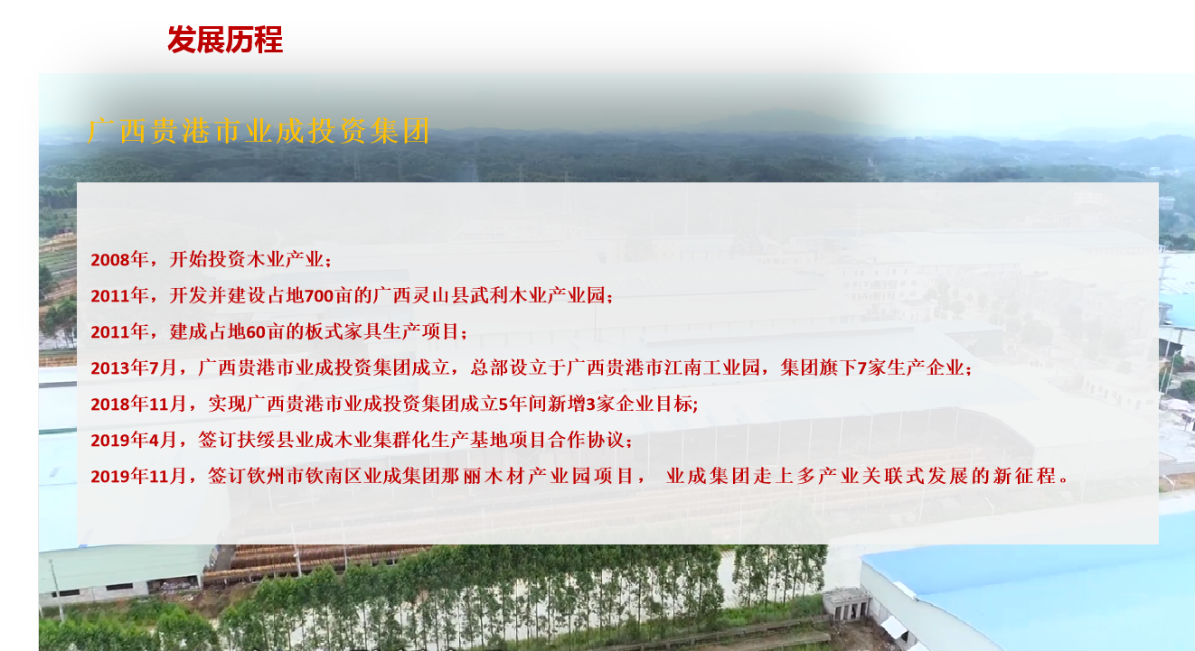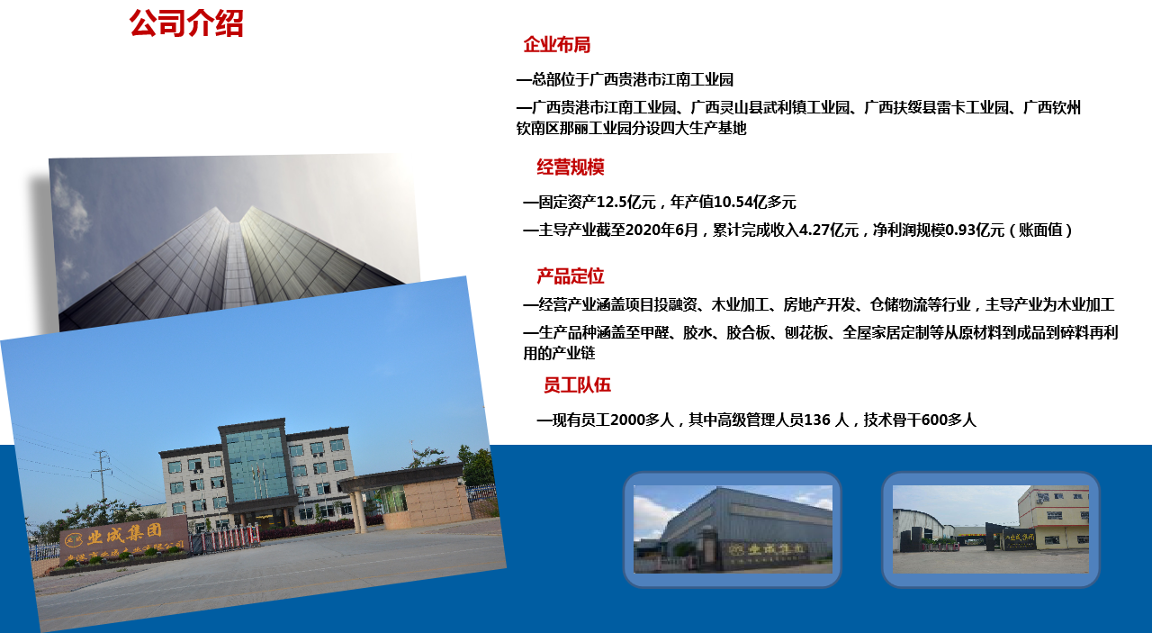 乐投手机在线官网(以下简称:业成集团)成立于2013年7月,总部设在广西贵港市江南工业园,两大生产基地分布在广西贵港市江南工业园、广西灵山县武利镇木业产业园,员工2000多人,固定资产12.5亿元,年产值10亿多元,经营产业涵盖项目投融资、木业加工、房地产开发、仓储物流等行业,主导产业为木业加工。...